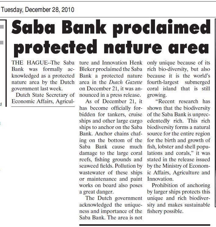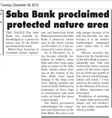 For those interested in the Caribbean's Sea newest marine protected area, Saba Bank, here's news from The Hague in a clipping sent by Dutch colleagues.